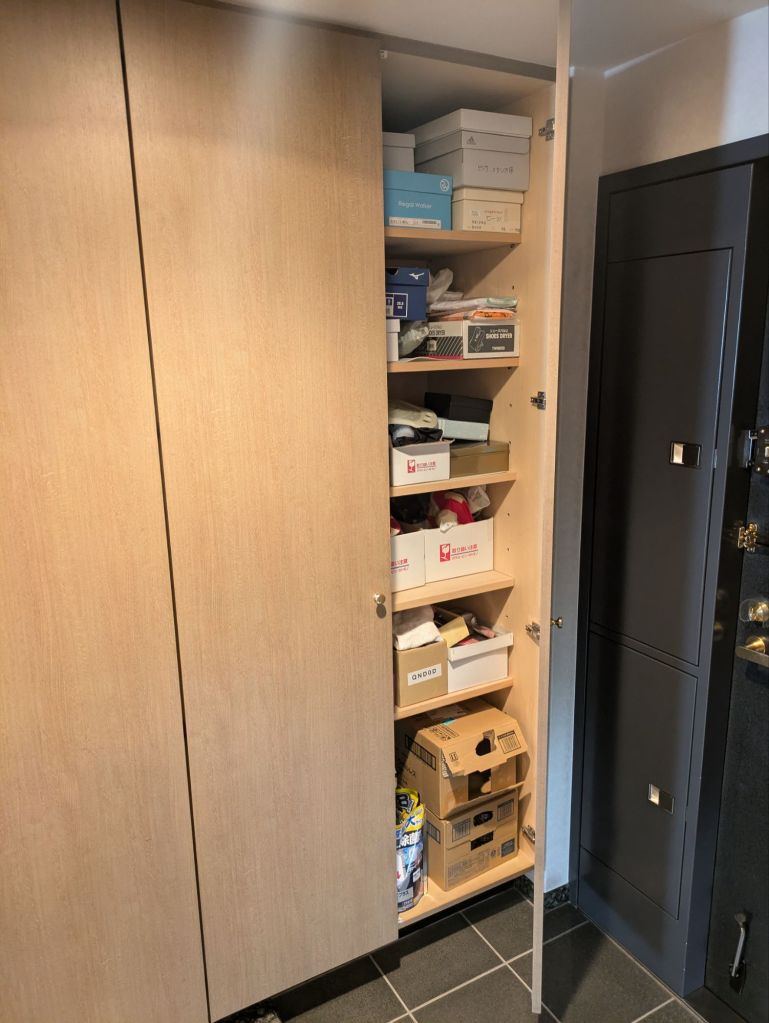 下駄箱の蝶番が外れたというご依頼。大きな下駄箱でこれを機に全て交換という事で計24箇所交換。